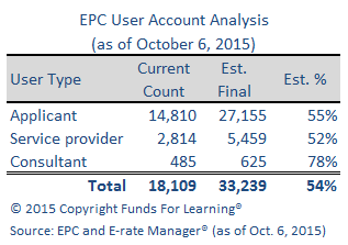 NOTE: The estimated final count of EPC users is based on (a) the count of unique individuals listed on FY2015 Form 471 applications, Block 1 and/or Block 6 (for applicants and consultants); and (b) the count of unique service providers identified on FY2015 funding requests. For purposes of this analysis, it is assumed that there will be only 1 individual account per service provider.